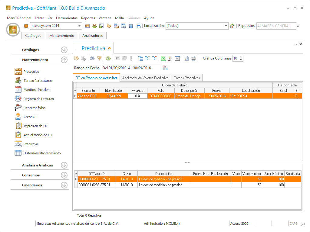 En este módulo actualizamos las lecturas que fueron programadas en el protocolo de mantenimiento como tareas predictiva, las mediciones de predictivos son utilizados para poder detectar algún problema de algún equipo antes de que falle, normalmente este tipo de mediciones se realiza con medidores especializados como termógrafos, osciloscopios, volt-amperímetros que detectan variación comparándolas contra los valores normales o críticos estos valores son registrados en el sistema para que en momento que se registre un valor que se sale de los valores óptimos de operación dispare una alarma que es enviada a un correo electrónico para tomar acciones, hay dos de valoración el máximo el mínimo el crítico máximo y el crítico mínimo estos parámetros se valoran cuando el tomador de lectura la registra y realiza las acciones correspondientes.