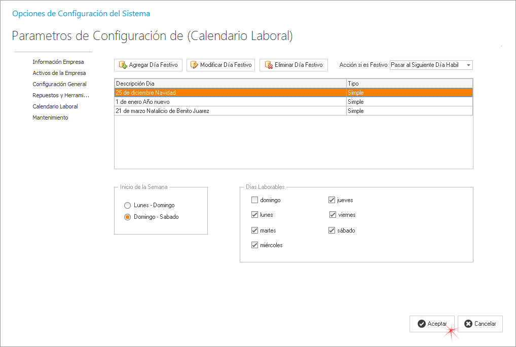 En la configuración de nuestro calendario laboral indicaremos los días que se va a laboral la empresa, también marcaremos los días de la semana que se trabajan o si hay un día de descanso, además indicaremos el día en que inicia la semana laboral. Todos estos días festivos y días laborables son de gran utilidad al momento de generar las fechas de los mantenimientos de los elementos. Se puede llegar el caso si cae el mantenimiento en día festivo, en este caso podemos configurar si queremos que el mantenimiento se realice en el siguiente día hábil o realizarlos en el anterior día hábil.