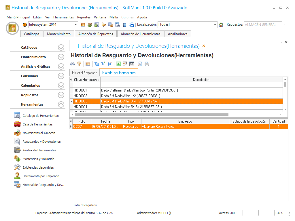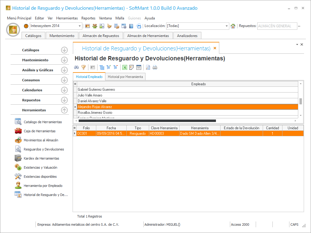 Para llevar un control de los resguardos tenemos en este modulo en la pestaña de Historial Empleado nos muestra en la parte de arriba una malla donde nos muestra la información del empleado y en la malla de abajo tenemos la información de la herramienta y cuando estuvo en resguardo o fue devuelta, teniendo todo el Historial del resguardo y la devolución de herramientas.