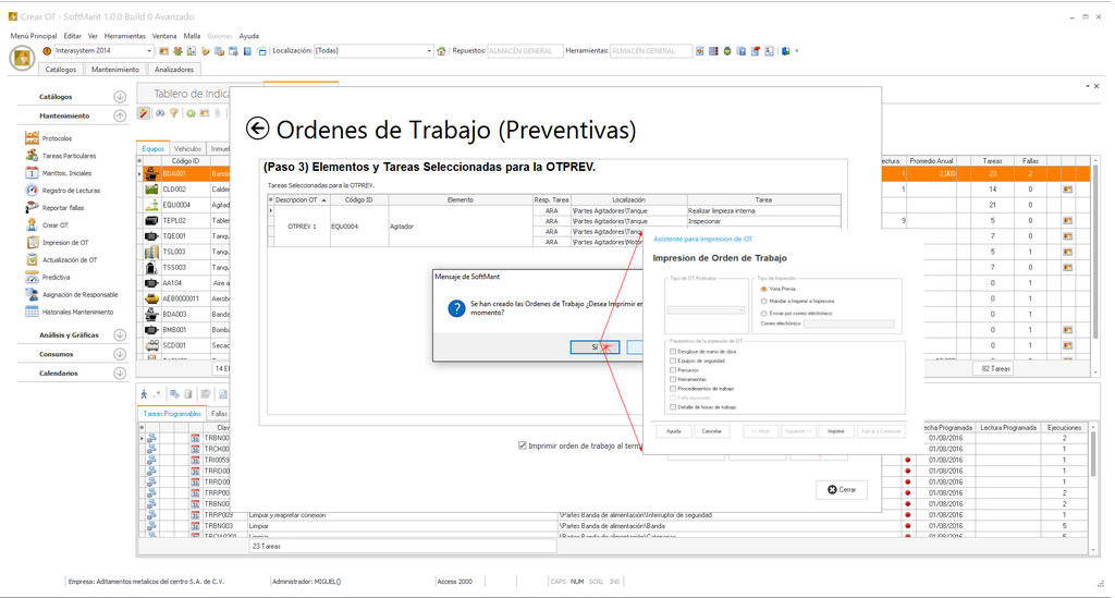 Al momento de terminar de registrar una Orden de Trabajo ya sea Preventiva, Correctiva, Rutinaria, etc nos aparecera un mensaje si queremos imprimir la Orden de Trabajo, si le damos en el boton "SI" nos aparecera un asistente en el cual podemos elegir los recursos que deseamos que lleve nuestra Orden de Trabajo, tambien la podemos mandar a imprimir en el módulo [Mantenimiento][Impresión de OT].