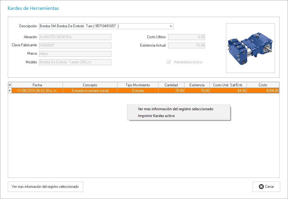 Para Imprimir y ver información de el Kardex lo que tenemos que hacer es darle clic derecho en nuestro mouse y en clic en Ver más información del registro seleccionado y Imprimir Kardex activo.