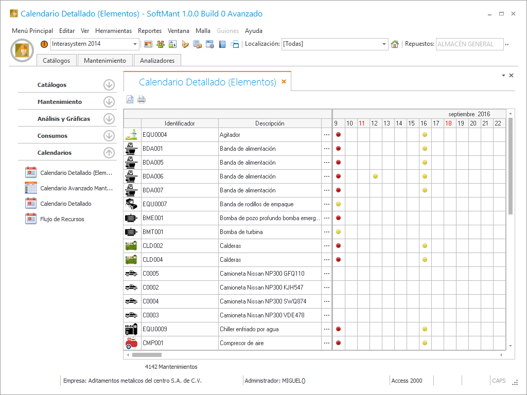 El calendario Detallado de Elementos nos calcula los mantenimientos a un año a partir de la fecha de hoy, los mantenimientos normales se visualizan con el color amarillo y con el color rojo son aquellos elementos que tenian mantenimiento de dias anteriores y lo podemos hacer el dia de hoy y generar el nuevo calculo de sus mantenimientos dependiendo de su frecuencia.