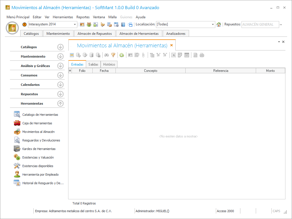 Esta esla pataña principal en donde se podra dar entrada de herramientas como salidas.