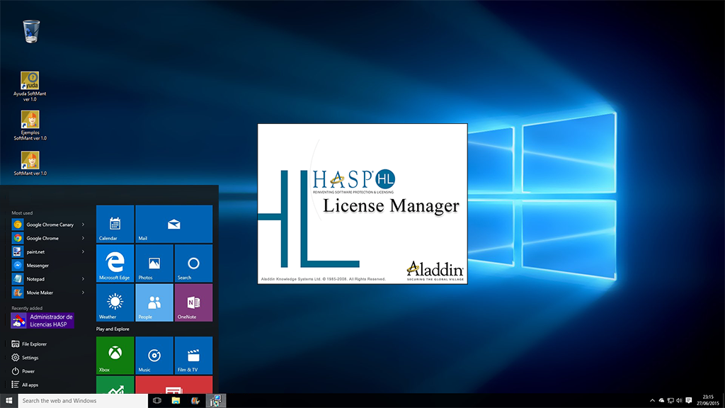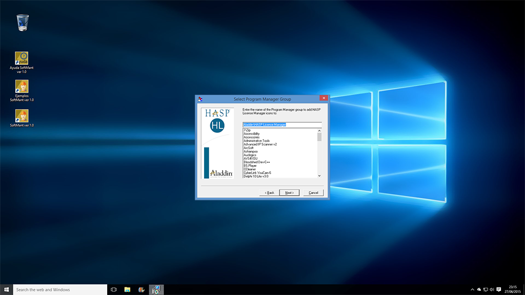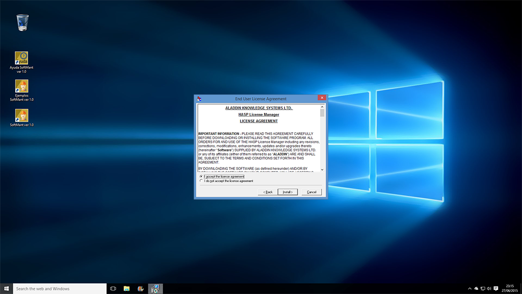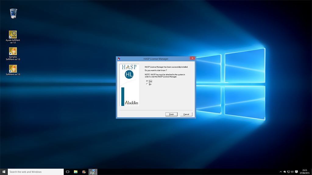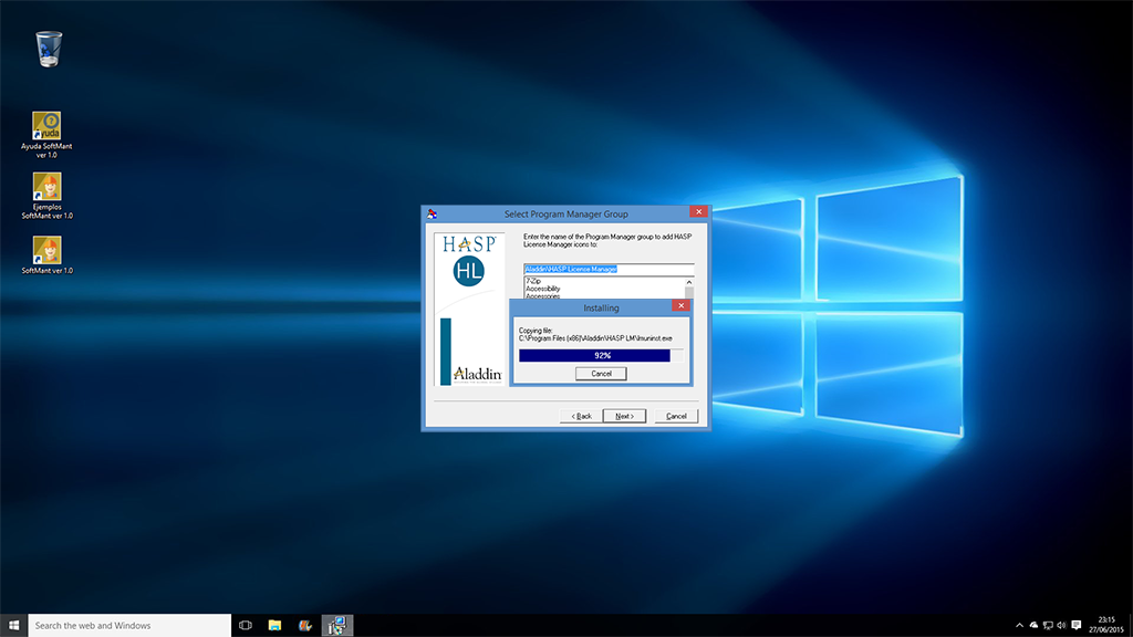 Cuando usted instaló SoftMant automáticamente se instalo un acceso directo a la aplicación Instalar Administrador de Licencias HASP localizado en la carpeta de Software InteraSystem del listado de programas del menú inicio, ejecute dicho programa y en instantes aparecerá la siguiente ventana:
