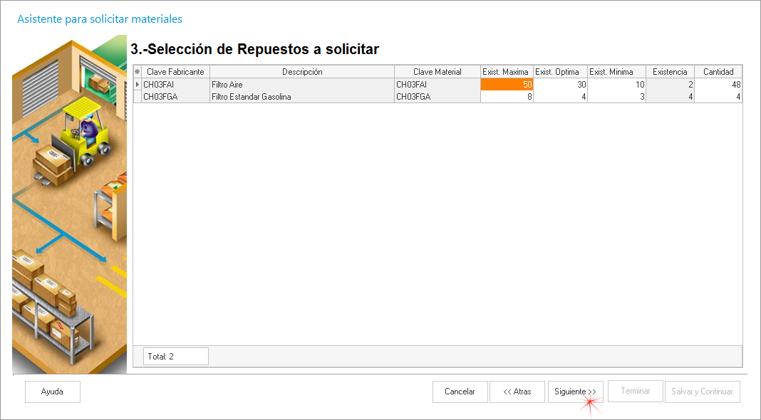 Selección de Repuesto a solicitar.