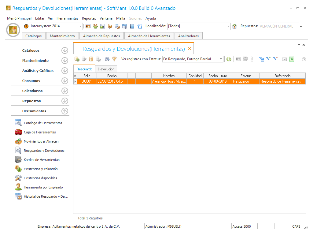 Al momento de realizar el movimiento lo podremos ver en la siguiente imagen con su folio, fecha de la realización, el responsable, cantidad de herramientas, la fecha límite, su estatus y la referencia del movimiento.