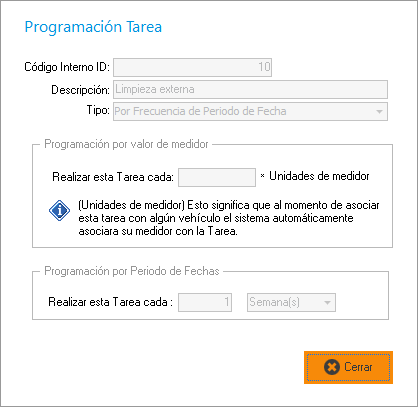 En esta ventana se puede apreciar información básica de la tarea para la programación de mantenimiento, como el tipo de frecuencia y su programación.