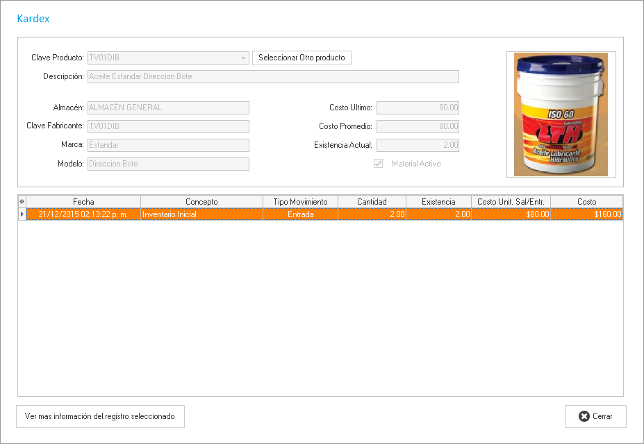 Este es nuestro Kardex que contiene la información principal del repuesto, la fecha y el concepto del movimiento, existencia actual e historica y el costo de producto.